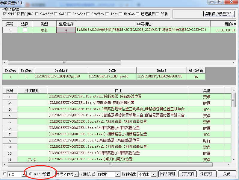 2)輸出配置 。 點擊上圖GOOSE設置,然后點擊右上角“讀取模型文件”導入SCD文件。
